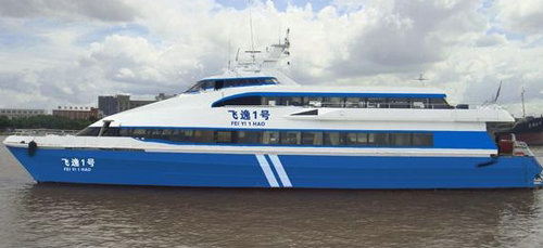 飛逸1號(hào)(快船)客輪是新奧海洋運(yùn)輸有限公司從寧波新購(gòu)進(jìn)的高速雙體豪華客輪。該船總長(zhǎng)38.8米、寬9.45米、時(shí)速達(dá)32.5海里、可載客290人,船體為鋁合金雙體結(jié)構(gòu),可航行沿海航區(qū)。船體采用流線型設(shè)計(jì),分上下兩層客艙;艙內(nèi)設(shè)施齊全,裝修華麗,配備航空座椅、地毯和中央空調(diào)等設(shè)施,具有安全、快速、舒適的乘坐特點(diǎn)。