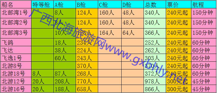 “北游8號(hào)”(快船)總長(zhǎng)38.2米,船寬10.2米,總噸位為460噸,載客定位為372個(gè)客位,抗風(fēng)能力為6級(jí)。航速為20節(jié),75分鐘就可以到達(dá)潿洲島。