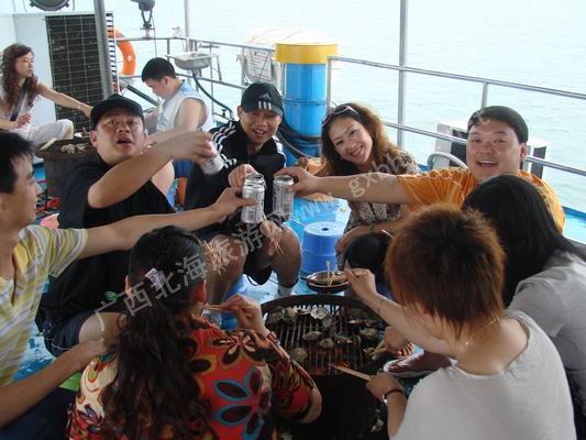 因為天氣晴好,風浪也不大,大家都上漁船到深一點的海里撒網(wǎng),順便來個海上自助燒烤,遺憾的是本人有點暈船,沒參與到多少,大部分時間趴在船內(nèi)挺尸,不過還是奉上一張其他人玩樂照給大家看看吧,其實還蠻有趣的。