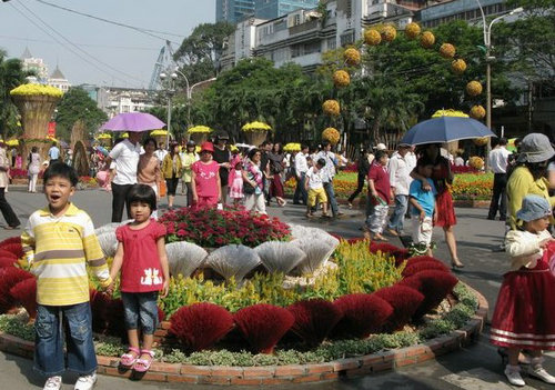 花市是越南春節(jié)重要活動(dòng)之一。比如河內(nèi),春節(jié)前約10天,花市就開始熱鬧。越南人最愛的年花有劍蘭、大麗菊、金桔和桃花。除了鮮花、盆景,花市還出售各式氣球、彩燈、玩具、年畫、春聯(lián)、年歷等,把相連的幾條街道裝點(diǎn)得五彩繽紛,喜氣洋洋。