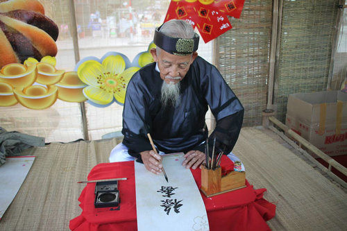 越南人過春節(jié)也有貼春聯(lián)習(xí)慣。以前春聯(lián)用漢字書寫,文字拼音化以后,現(xiàn)在大部分春聯(lián)改用拼音文字,每個(gè)拼音字是一個(gè)方塊,自成風(fēng)格。