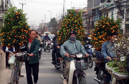 在越南首都河內(nèi)街頭,幾名居民拉著從花市買回的柑桔樹回家。與中國一樣,春節(jié)是越南最隆重的傳統(tǒng)節(jié)日,家家戶戶都會(huì)在節(jié)前準(zhǔn)備各種年貨。