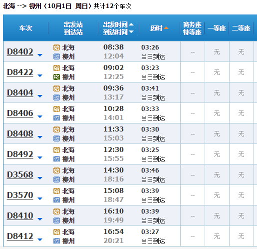 登陸12306網(wǎng)站可以看到,北海往返一些熱門地區(qū)的動(dòng)車票依然緊張,如10月1日的售票信息顯示,北海往返南寧、桂林、柳州等地的車票幾乎一票難求,大多數(shù)動(dòng)車組列車都為“無票”,只剩少量動(dòng)車還有無座票,以及普速列車有部分余票。