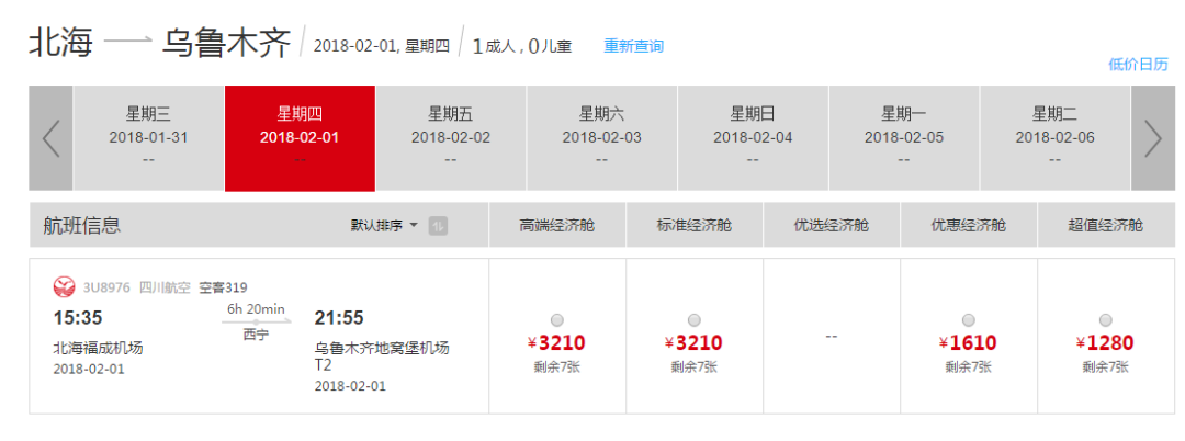 烏魯木齊地窩堡機場08:55—西寧曹家堡機場—北海福成機場14:50