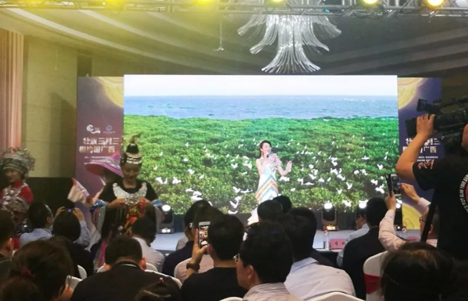 推介會(huì)上,不僅有身穿壯族傳統(tǒng)服裝的歌舞表演、自拍女王推介少數(shù)民族民俗,還通過(guò)PPT展示了廣西各大著名旅游景點(diǎn)、地標(biāo)建筑及廣西古老的文化積淀,重點(diǎn)對(duì)北海濱海度假旅游、桂林山水休閑度假游、長(zhǎng)壽之鄉(xiāng)休閑養(yǎng)生游、少數(shù)民族風(fēng)情游、中越邊境探秘游等豐富多彩的旅游資源進(jìn)行了介紹。