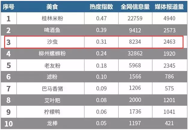 4月,沙蟲的熱度指數(shù)0.31,較3月稍有下降,位居榜單第三名。排在前十名的美食不同地域、不同種類,均代表了廣西本土美食的特色。