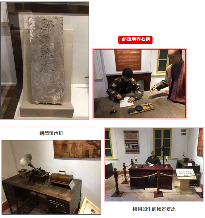 展館展出的珍貴郵電文物包括大清郵政北海分局時期使用的郵政地界石碑、郵政蓋戳臺、貴重包裹存貯木柜等。