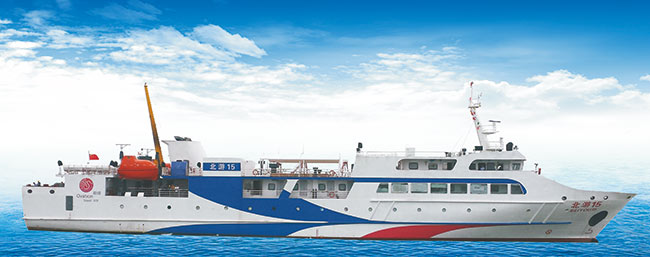 北海往返潿洲島的大慢船有北游15,是觀光船,有超大觀光甲板,載客量636人,航行時間110分鐘,有一層客艙、二層客艙、二層貴賓室、三層會議室。