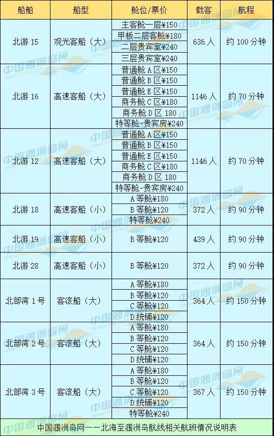 北海往返潿洲島的大快船有北游12和北游16,載客量在1000人左右,航行時間70分鐘,主要有三種艙位選擇,分別為普通艙、商務艙和特等艙。