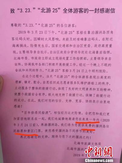 這份《感謝信》稱,“‘百年修得同船渡’,相信經(jīng)歷這次險情,會把您和我們更加緊密地聯(lián)系在一起,我們將誠摯地邀請您在未來一年內(nèi)(2020年3月24日前),再游潿洲島。我們將為您提供免費的潿洲島往返船票和景區(qū)門票……。