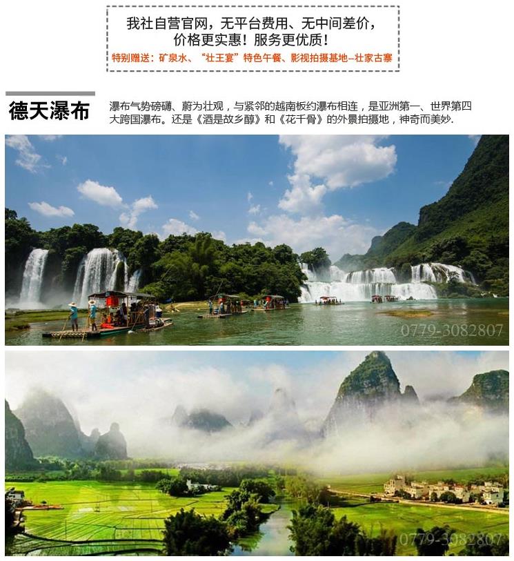 第二天:早餐后乘車前往國家特級景點--德天跨國大瀑布風景區(qū),徒步進入景區(qū)游覽亞洲第一大、世界第四大跨國瀑布,瀑布由【中國德天瀑布】和【越南板約瀑布】相連構(gòu)成,橫跨中越兩國邊境,寬208米,落差70米,縱深60米,三級跌落,雄奇壯闊!而后徜徉于【清代53號界碑】旁邊貿(mào)小集市或于新舊國界碑前拍照留影。參觀影視拍攝基地--【壯家古寨】,這里是當?shù)乇4孀钔暾脑鷳B(tài)壯族桿欄式古村寨。走進觀光村寨看到屋舍儼然,阡陌交通,雞犬相聞,享用“壯王宴”特色午餐。乘車返回北海。