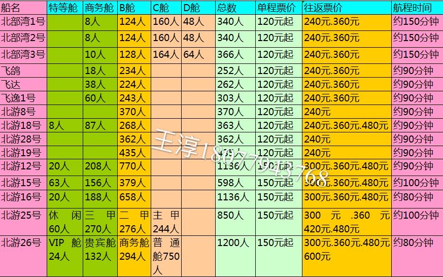 北游8號,北游19號,北游28號,B等艙(位于一樓)120/人