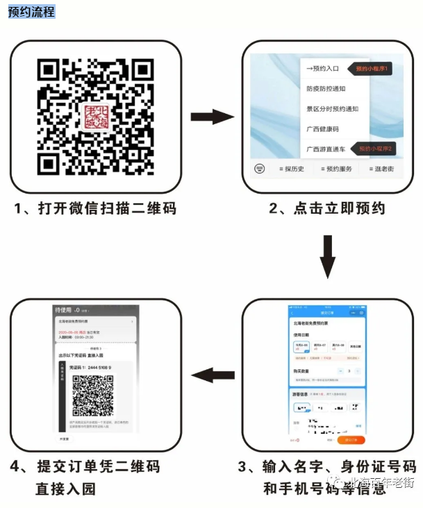1、10月1日至8日景區(qū)實行門票分時預(yù)約制度,游客需提前在網(wǎng)上預(yù)約門票(免費),出示預(yù)約門票二維碼,直接入園,無需取票。游客可通過“北海百年老街”官方微信公眾號、廣西直通車、美團等小程序、電商平臺進行預(yù)約。