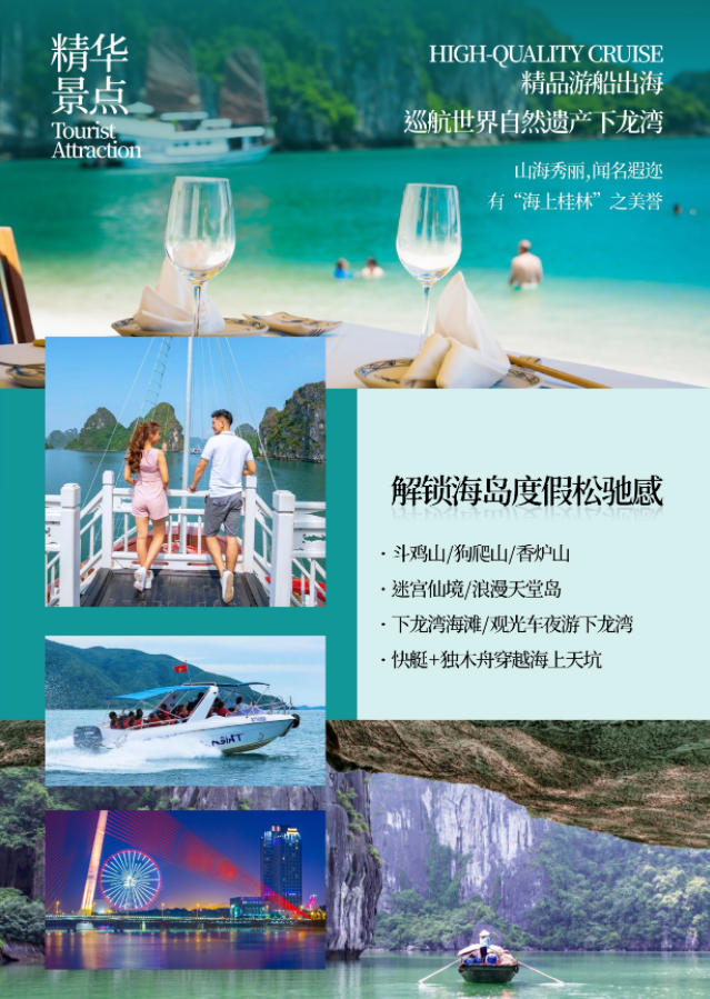 早餐后,乘車前往巡州島度假區(qū)、欣賞海岸風(fēng)光 , 后乘越南特色紅木游船漫游世界八大自然遺產(chǎn)之一的“海漫游世界八大自然遺產(chǎn)之一的“海上桂林” —下龍灣 (游覽時(shí)間約 4H) (在 1500 多平方公里的海面上、聳立著 3600 多座大小不一、千姿百態(tài)的喀斯特地貌的山石、更以其“海美、山幽、洞奇”三絕而享譽(yù)天下) ——觀狗爬山、香爐山、 斗雞山等數(shù)不勝數(shù)的風(fēng)景盡收眼底,再從斗雞石出發(fā)游覽下龍灣的精華景點(diǎn)之一【迷宮仙境】。午餐安排于船上進(jìn)行用餐,下龍灣亦有小漁船如影相隨,把酒臨風(fēng),去國懷鄉(xiāng)之憂蕩然無存,在天海一色中的游船上大快朵頤的美妙感覺在您的全身悄悄蔓延。午餐后乘坐【快艇】前往【海上天坑】,抵達(dá)洞口后換成小木船進(jìn)入洞內(nèi) ,海上天坑是一個(gè) 360 度皆為垂直絕壁的封閉海灣 ,空靈幽閉。湖水清澈見底 ,水平如鏡,在四面高聳徒峭山崖的環(huán)抱中,仿佛給人一種與世隔絕的感覺。游完后前往越南最浪漫、最漂亮的島嶼—【天堂島】, 島上活動(dòng) 1-2 小時(shí)。細(xì)白的沙灘上可以玩各種沙灘游戲 (游戲道具自備) ,在指定區(qū)域還可以游泳,登上島嶼的山頂俯視下龍灣海上桂林全景,拍攝您心意的美照,隨后坐船返回碼頭下船 ,告別上帝賜于越南最好的禮物-下龍灣。