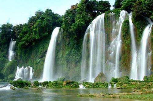 越南板約瀑布位于廣西邊陲大新縣、中越邊境交界處歸春河上游越南一方。與緊鄰的德天瀑布相連,堪稱世界第二大跨國(guó)瀑布,僅次于美國(guó)和加拿大邊境的尼亞加拉大瀑布。瀑布上游河水時(shí)急時(shí)緩,時(shí)分時(shí)合,迂回曲折,于參天古木之間、花草掩映之下,百鳥鳴徊。忽遇斷崖、飛瀉而下,恰似一巨大銀練高懸于谷峽之上。站在瀑布下,水氣蒸騰,上接云漢,滾滾洪流,濤聲回蕩于山谷,聲若巨雷數(shù)里可聞。若遇晴日,彩虹飛渡,其魄力、其風(fēng)采、其氣勢(shì)震魂攝魄,搖動(dòng)心旌。