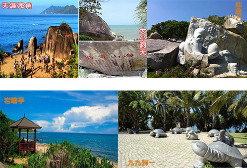 海山奇觀:山、海、林泉是構(gòu)成一個(gè)旅游名勝必不可少的條件。這里,崖州灣弧弦百里,碧波萬(wàn)傾;鰲山云深林翠,巖奇洞幽;海岸遍布神工鬼斧,肖形狀物之大小磊群;山海之間宛如一幅古樸雄壯的長(zhǎng)卷畫圖。