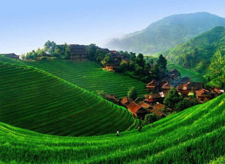 龍脊梯田距龍勝縣城27公里,距桂林市80公里,景區(qū)面積共66平方公里,梯田分布在海拔300至1100米之間,坡度大多在26至35度之間,最大坡度達(dá)50度。雖然南國山區(qū)處處有梯田,可是象龍脊梯田這樣規(guī)模的實(shí)屬罕見。龍脊梯田始建于元朝,完工于清初,距今已有650多年歷史。龍脊開山造田的祖先們當(dāng)初沒有想到,他們用血汗和生命開出來的梯田,竟變成了如此嫵媚瀟灑的曲線世界。在漫長的歲月中,人們在大自然中求生存的堅(jiān)強(qiáng)意志,在認(rèn)識自然和建設(shè)家園中所表現(xiàn)的智慧和力量,在這里被充分地體現(xiàn)出來。
