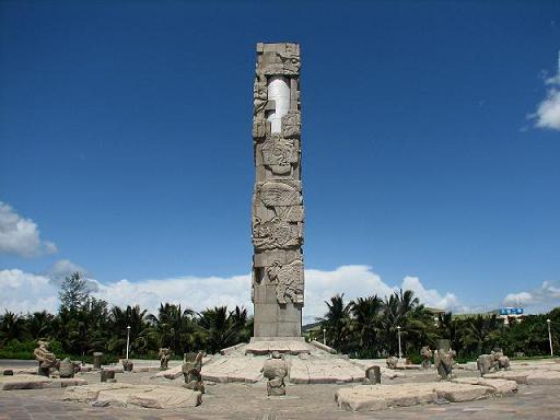 亞龍灣中心廣場,位于三亞市東南28公里處。騰柱向藍(lán)天升騰,以雕塑群向大地和大海延伸,其宏偉氣勢和獨特的藝術(shù)造型,以有限的藝術(shù)空間形式,引導(dǎo)我們的想象向無限的空間擴(kuò)展。屹立的圖騰柱是廣場的最高點,高26.8米,由200多塊巨大的花崗石和直徑2.5米的鋁合金柱組成。上面雕刻有龍、鳳、太陽鳥、魚以及風(fēng)雨雷電四神的圖案。 圍繞圖騰柱的中心雕塑區(qū),形成三圈石硨,氣勢宏大、形象獨特:第一圈有蒼龍、白虎、朱雀、玄武四季標(biāo)識與日晷24節(jié)氣雕塑;第二圈表現(xiàn)盤古開天地、女媧補天、嫦娥奔月、弄天舞干戚、大禹治水、牛郎織女、后羿射日、夸父追日等八個遠(yuǎn)古神話;第三圈反映天文、人、動物、植物萬物生靈及八位中國古代之神。圖騰柱和雕塑群渾然一體,構(gòu)成強烈的中國古天文意識和東方神秘色彩。廣場外圍設(shè)計的五組白色風(fēng)帆式的尖頂帳篷及大型彩色噴泉,給具有古老文化意蘊的雕塑增添了現(xiàn)代氣息。